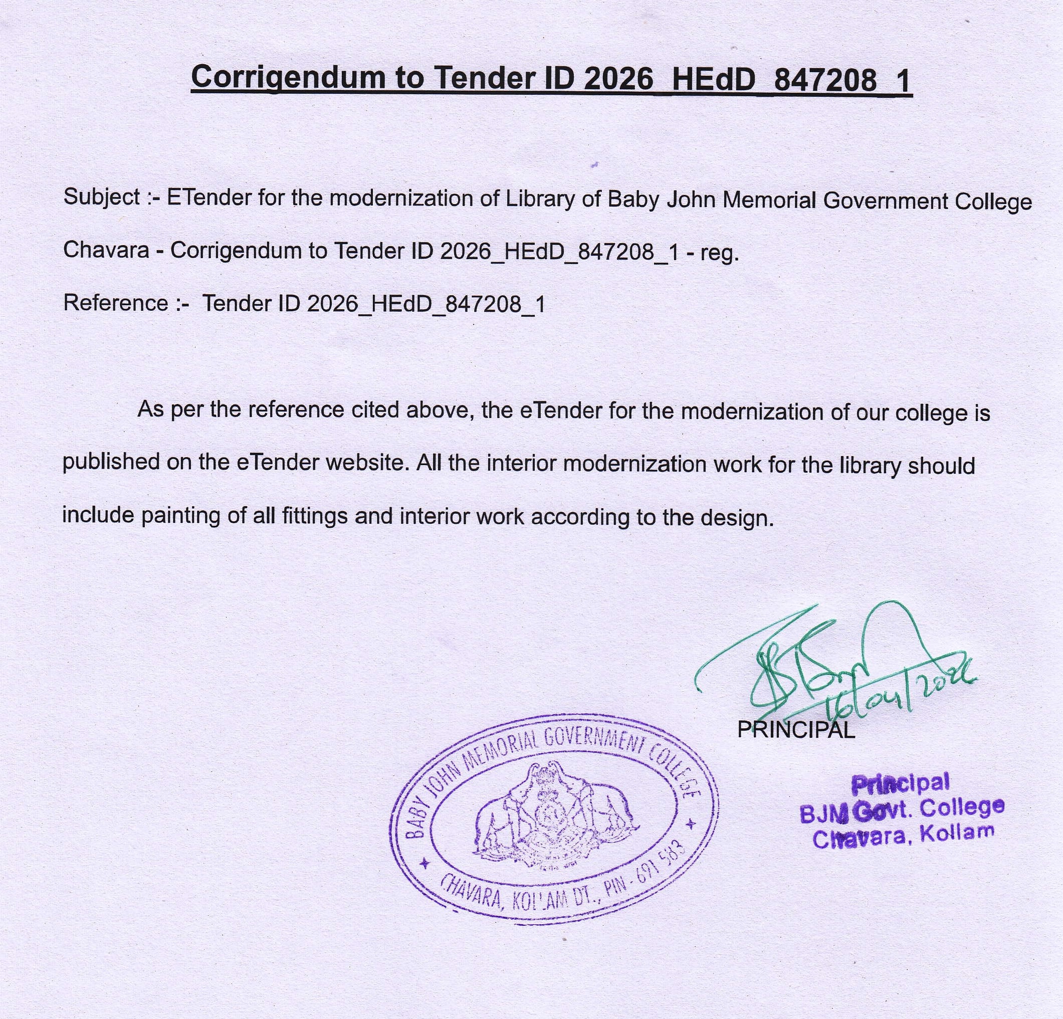 E-Tender for the modernization of Library of Baby John Memorial Government College